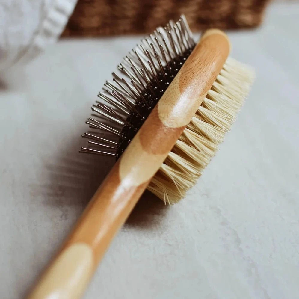 Maintain your furry friend’s fabulous fur with the Bamboo Dog Brush that boasts a sisal bristle side for removing loose hair and smoothing their coat and a wire bristle side for tackling thick fur and light tangles. When it’s time for a new brush, easily remove and recycle the pins and compost the rest!