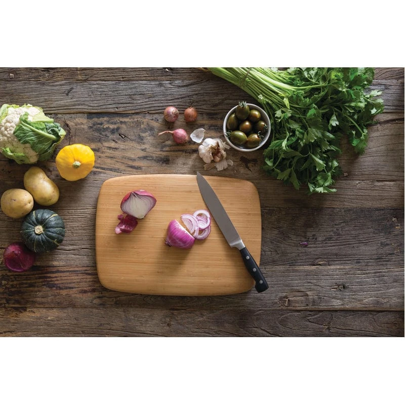 Effortlessly slice and serve with these Classic Bamboo Cutting and Serving Boards. These handcrafted wooden boards are perfect for light tasks, and their rounded edges prevent any table damage. The bamboo is naturally moisture-resistant, so no warping or swelling will occur with washing. Sustainable and reversible, these boards allow for quick cutting and serving.