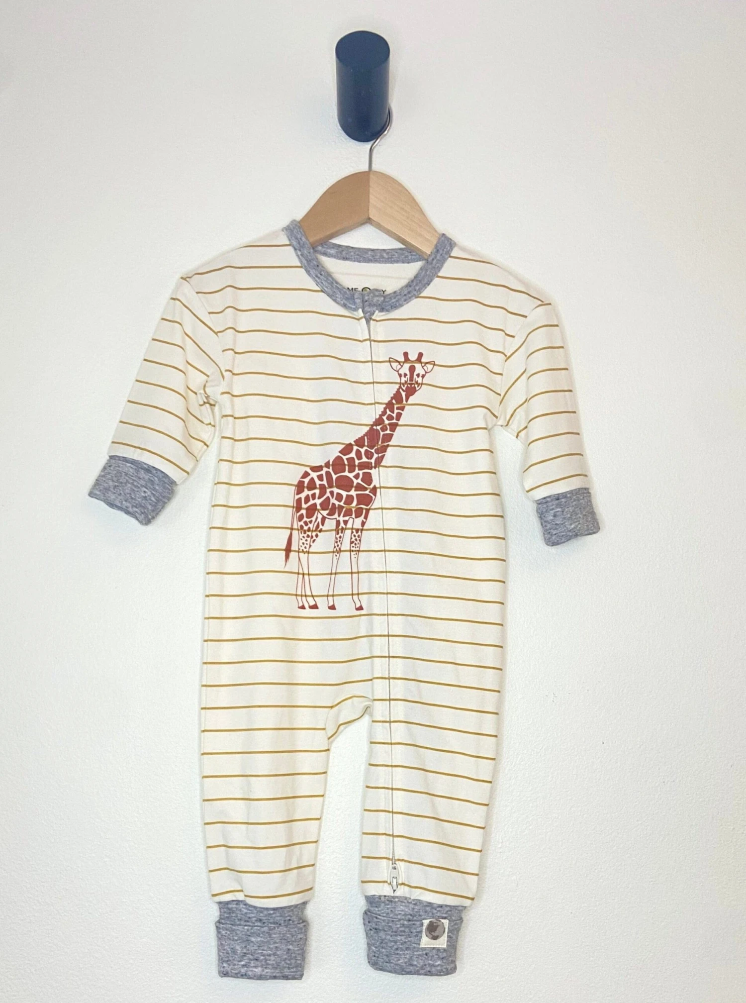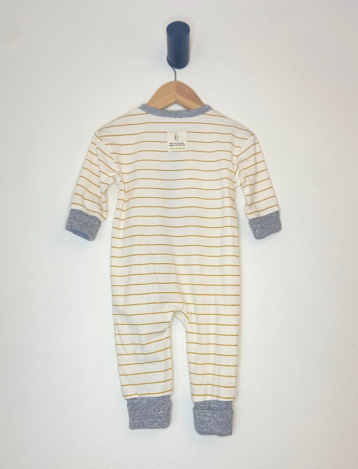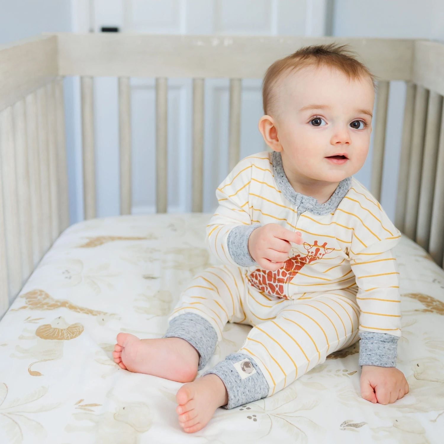 Soft, sustainable, and made to grow with your little one. This adorable giraffe coverall brings comfort and conscious style to your baby’s wardrobe. Designed in a warm mustard stripe with heather grey sleeves, it’s crafted from a super-soft blend of organic cotton and recycled polyester—each one diverts 3 plastic bottles from landfills and oceans.