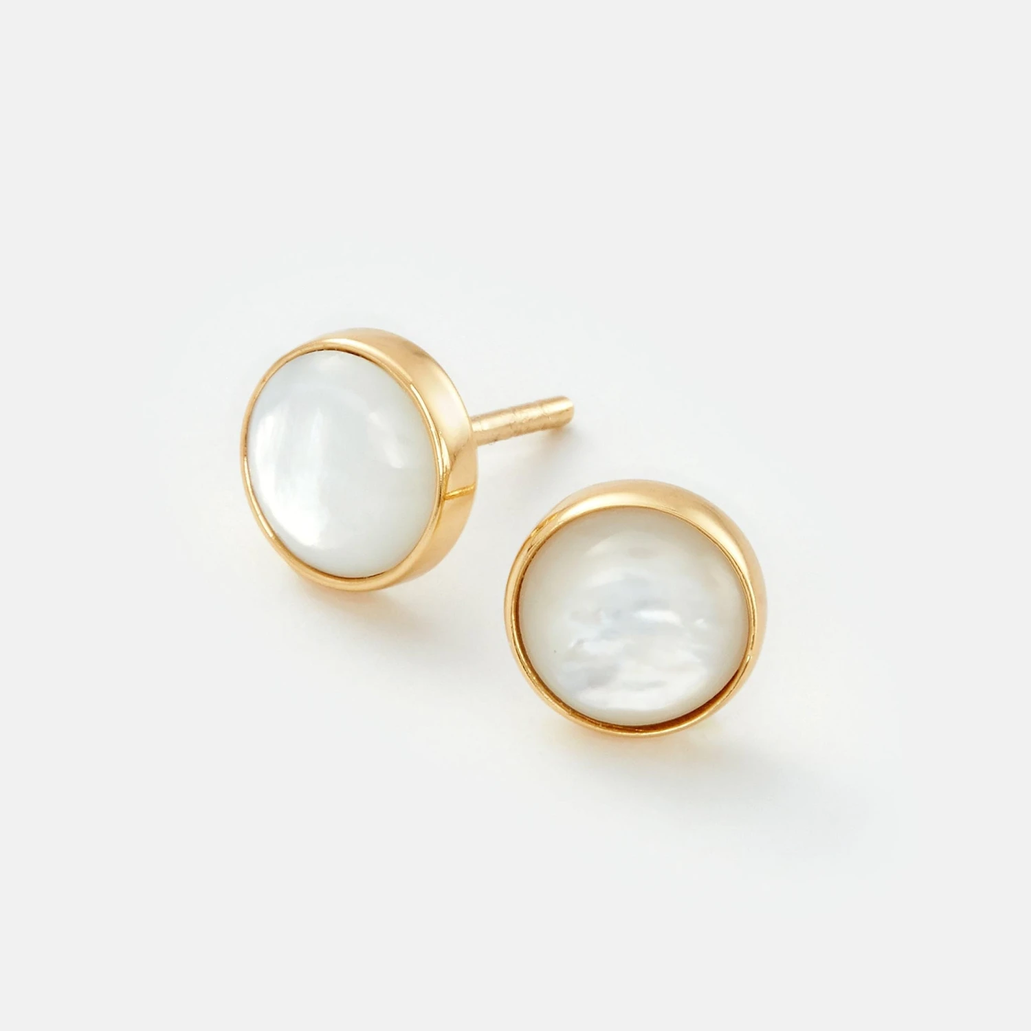 This set of Pearl Stud Earrings boasts a contemporary and delicate design that can be worn on a daily basis. They are a go-to favorite for any occasion. The stunning Mother of Pearl has a heavenly shimmer and will infuse any outfit with sophistication. 8mm round Mother of Pearl Recycled 14k gold filled.