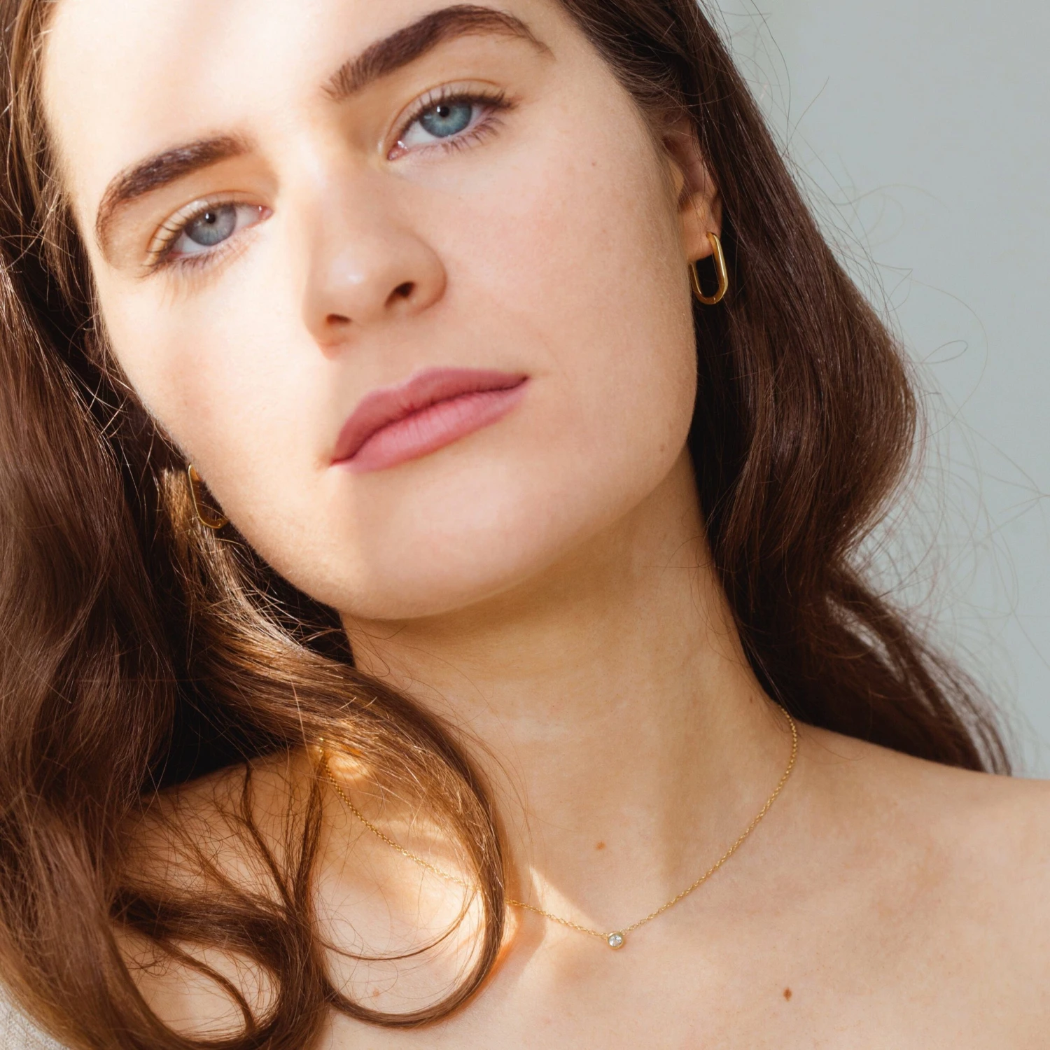 This exquisite midi hoop earring boasts a dainty white topaz stone on one side, providing a distinctive and attention-grabbing appearance. Its reversible nature showcases a simplistic design, giving you the option to turn it over for a sleek gold finish. Versatile and perfect for everyday wear!
