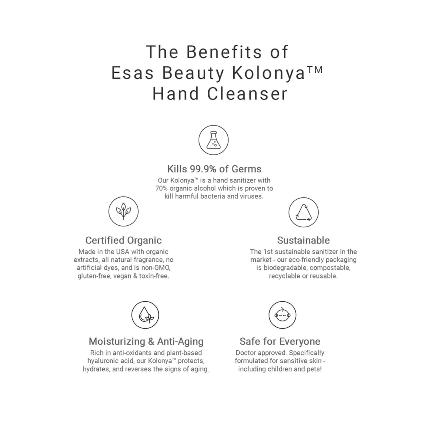 WHAT IS KOLONYA? : A 4-in-1 rinse-free hand cleanser, hydrating serum, anti-oxidant boost, and refreshing mist all in one! Choose from 20 all-natural scents to boost your mood and feel refreshed. Comes in 3 different sizes. Our Esas Kolonyaâ„¢ is based on a 200-year old Turkish tradition of welcoming guests with a hand-cleansing ritual upon entering the home.