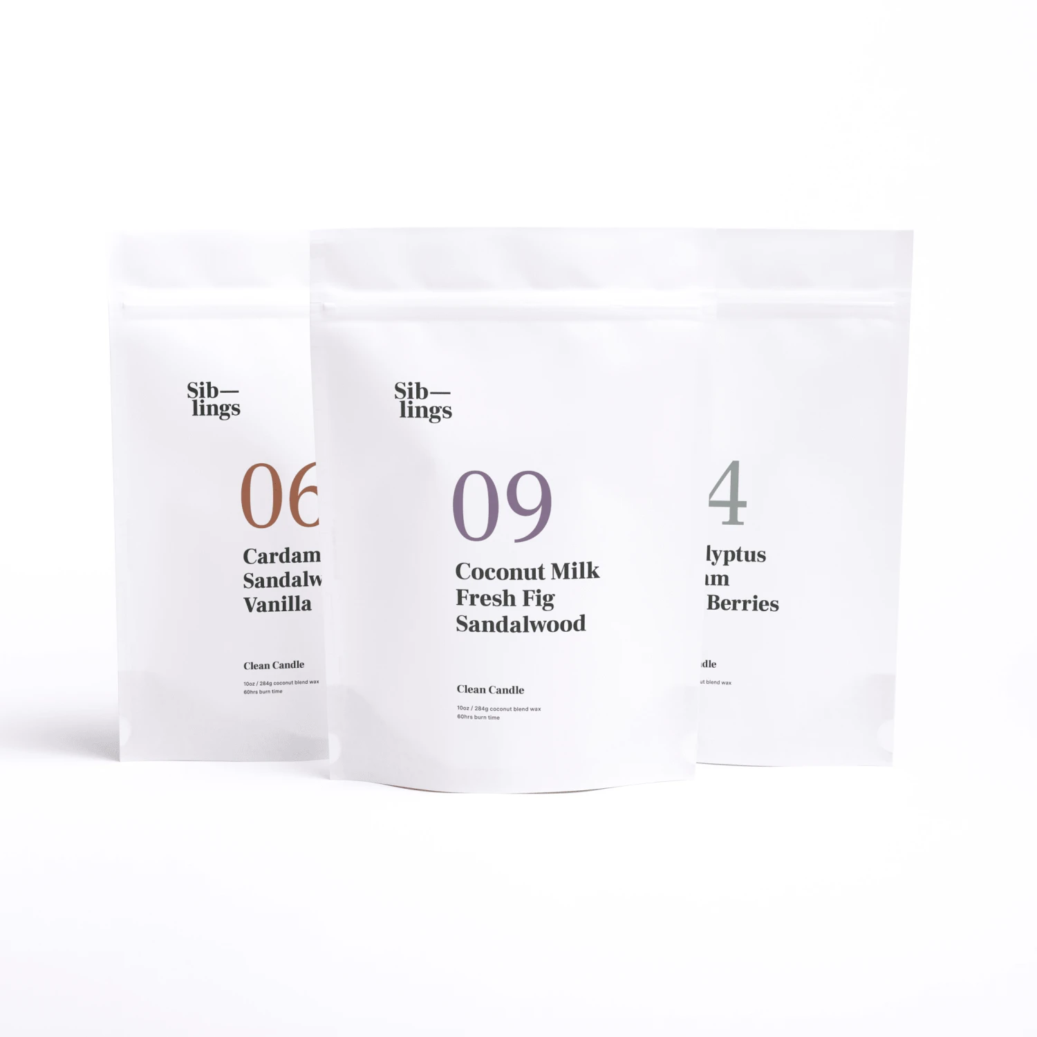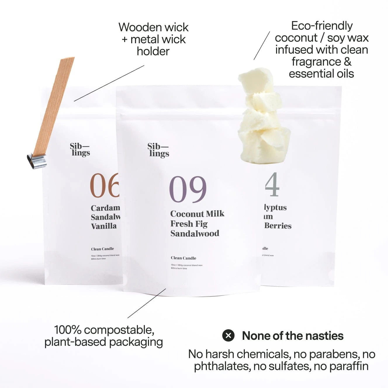 Once fully used, the wax bag can be composted. The wick holder is reusable with future refills. Any remaining wax can be safely composted or wiped clean for reuse. Packaging is recyclable or compostable, depending on local facilities.
