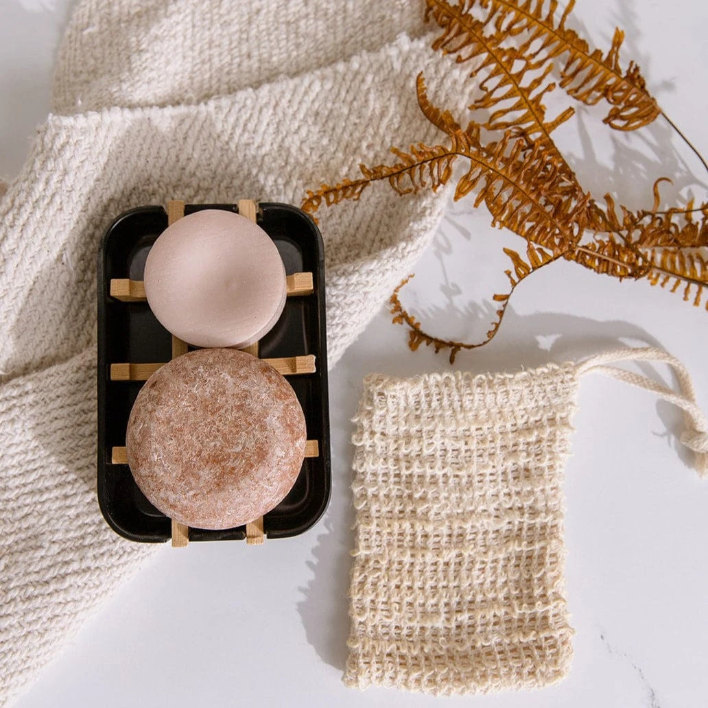 Elevate your hair care routine the zero-waste way with our hair care mini kit. Complete with our salon-quality shampoo and conditioner bars, agave soap saver bag and a plastic-free soap dish, if you’ve been thinking of making the switch from bottles to bars, it’s never been easier! Only made with natural ingredients, these bars take the place of up to 3, 16 oz shampoo and conditioner bottles, lather beautifully and infuse hair and scalp with the most nourishing ingredients nature has to offer. The agave soap bag and soap dish help extend the life of your bars by keeping them dry.Â